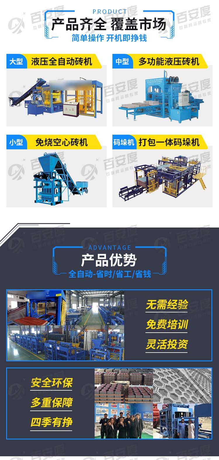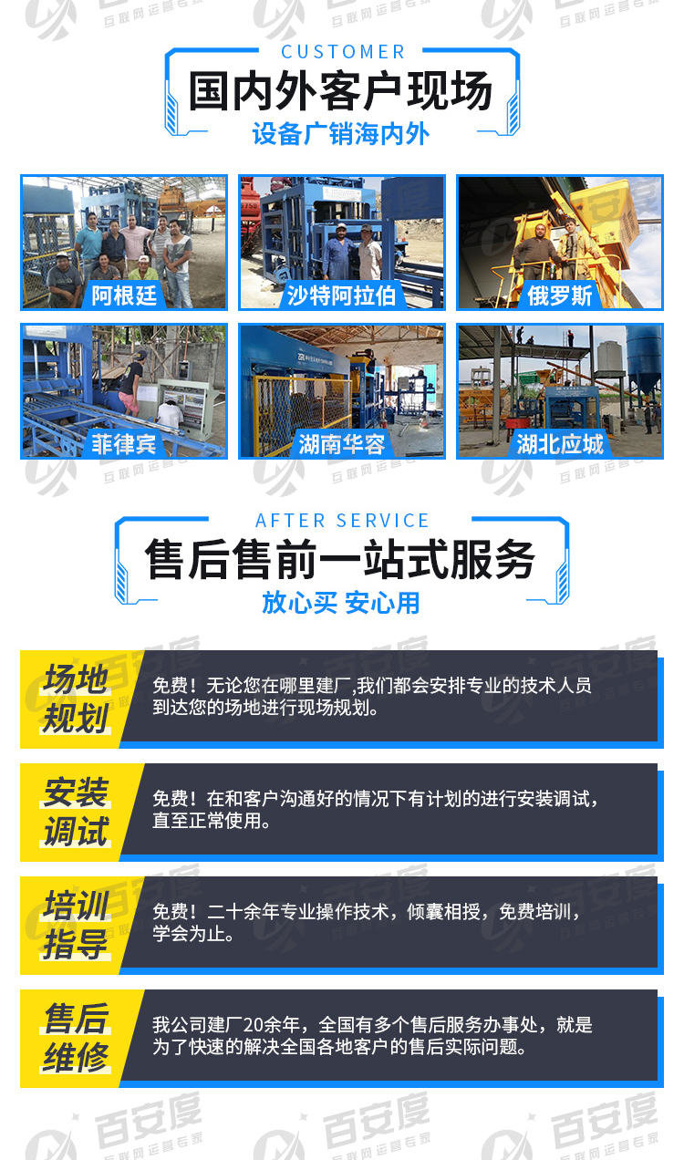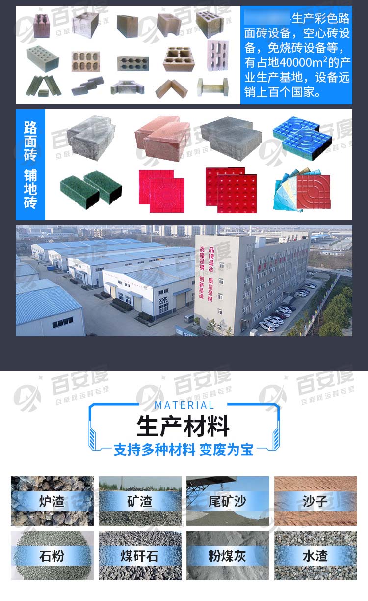 客户专注生产彩色路面砖设备,空心砖设备,免烧砖设备等,有占地40000m2的产业生产基地,设备远销上百个国家。